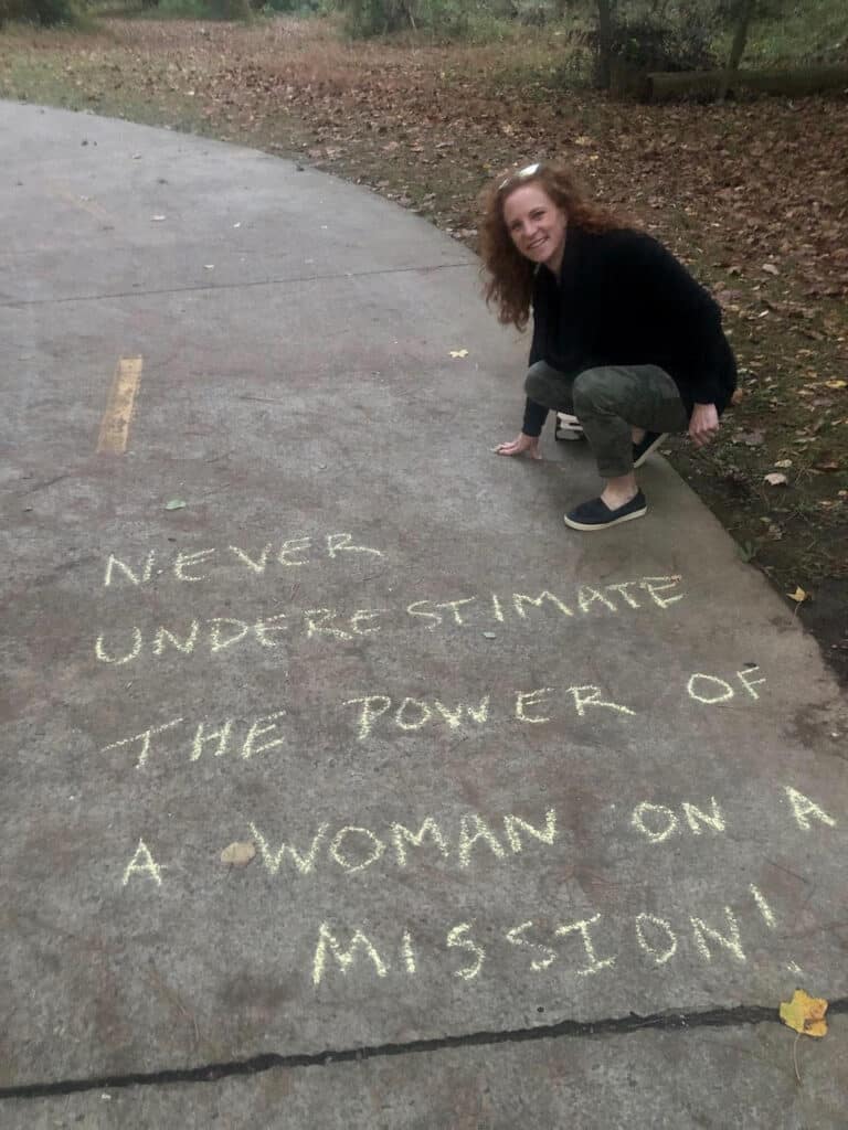 Her youngest daughter and close friends help her chalk the Greenway before race day, writing encouraging messages and often the names of athletes in her training group. It is thoughtful. It is personal. It is deeply community-driven. That is not accidental.